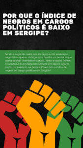 Negros E Negras Na Política Por Max Prejuízo, psicólogo e ex-vereador por Aracaju Sergipe não elegeu Deputados Negros para o Parlamento Estadual na última eleição. A Alese (Assembleia Legislativa Do Estado De Sergipe) não tem nenhum Deputado Estadual de representatividade negra na atual composição. Por que isso acontece? Dos 24 Deputados Estaduais, 14 autodeclararam pardos e 18 autodeclararam brancos. É preciso pensar em representatividade e como essa ausência pode ser significativa no contexto de valorização e fundamentação de espaços para negros no Parlamento. Vamos firmar a representatividade negra em nossa sociedade.