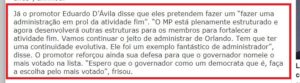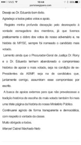 corredores é que um presidente de outro órgão “bateu o martelo” em defesa de Eduardo D`Ávila e essa ingerência revoltou todos os promotores e alguns procuradores. A nota de Manoel Cabral Machado Neto divulgada ontem, 05, não apenas demonstrou a insatisfação da classe, mas detonou “a busca de apoios externos para que não prevalecesse a tradição histórica…” Leia toda nota no print ao lado.
