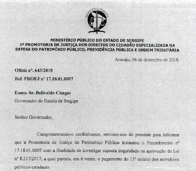 O procedimento tramita na Promotoria de Justiça dos Direitos do Cidadão Especializada na Defesa do Patrimônio Público, Previdência Pública e Ordem Tributária de Aracaju, e, entre outras informações, pede esclarecimentos sobre a situação financeira do Estado, a necessidade do parcelamento e se a PGE deu parecer favorável constitucionalmente à referida proposta que foi transformada em lei.