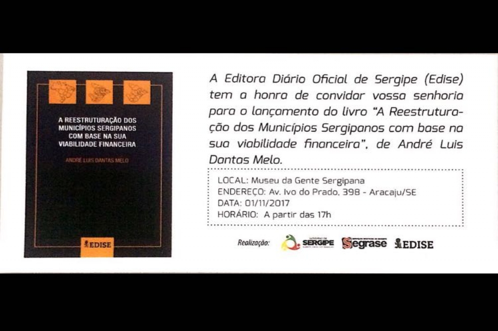 “A reestruturação dos Municípios Sergipanos com base na sua viabilidade financeira”, será lançado hoje, 01 A Editora Diário Oficial de Sergipe, lançará hoje, 01, a partir das 17h, no Museu da Gente Sergipana o livro “A reestruturação dos Municípios Sergipanos com base na sua viabilidade financeira”, de André Luis Dantas Melo. Toda renda será destinada ao “Lar Dulce Lar”