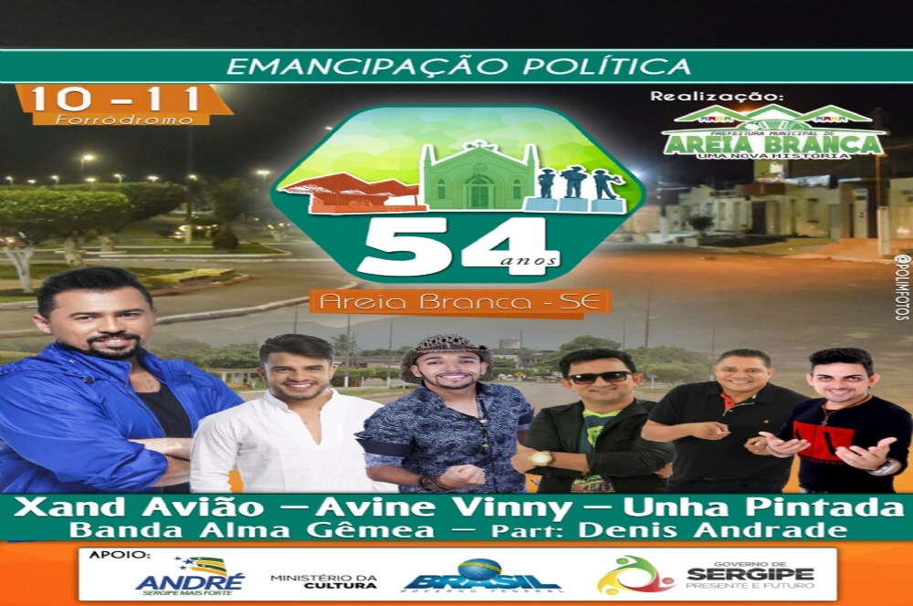 cartaz ao lado da fesata da emancipação política de Areia Branca, que será realizada nos dias 10 e 11 deste mês, com o apoio do Ministério da Cultura, do governo do Estado e da Prefeitura, tem ao lado a logomarca da campanha de André Moura “Sergipe mais forte” Um absurdo! Como envolve recursos federais o MPF de Sergipe deve ingressar com ação, assim como o MPE já que envolve também recursos do governo estadual e da Prefeitura.