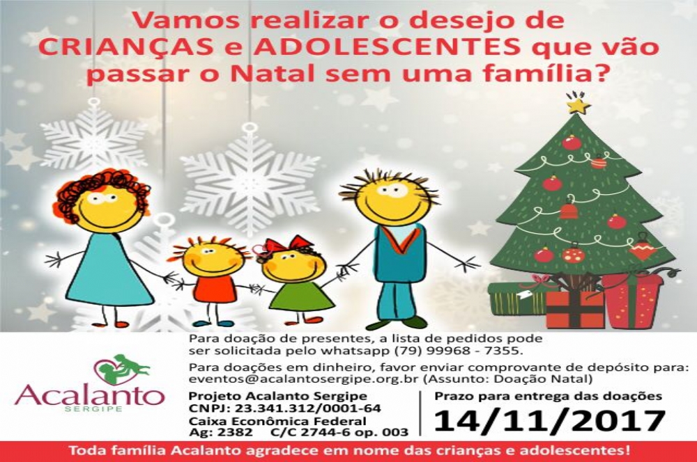 Vamos realizar o desejo de crianças e adolescentes que vão passar o Natal sem uma família? Se você quer contribuir com essa campanha do Projeto Acalanto Sergipe, pode fazer doação em dinheiro por meio de depósito na conta do Projeto: Projeto Acalanto Sergipe. Caixa Econômica. Ag. 2382 c/c 2744-6 op 03. CNPJ: 23.341.312/0001-64.