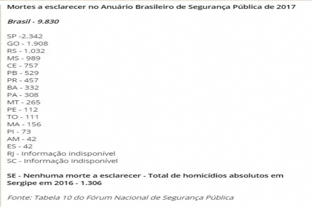 Sergipe não tem uma morte a esclarecer no anuário 2017. Ao todo são quase 10 mil em todo país A assessoria da SSP reconhece que a situação da taxa de Sergipe é altíssima e que no anuário de 2018, tendo como referência 2017 o Estado deve sair da atual condição, porém chama a atenção para um dado curioso, o número alto de mortes a esclarecer, cerca de 10 mil em todo país (veja print ao lado). Sergipe não tem nenhuma a esclarecer.