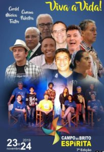Campo do Brito Espírita – Eu vou! Evento gratuito O Campo do Brito Espírita é um evento bienal realizado pelo “Centro Espírita Unidos na Fé” e sua 7ª edição acontecerá nos dias 23 e 24 de novembro de 2019, na cidade de Campo do Brito/SE, com o tema central “Viva a Vida” e a participação de diversos palestrantes e artistas espíritas: palestra – Marcel Mariano/BA, Frederico Menezes/PE e Júlio César Góes/SE; música – Moacyr Camargo/SP e Ítalo Lima/SE; poesia – Edgar Diniz/PE; teatro – Cia de Teatro Espírita Hariboll/RS e Teatro Móvel Cornélio Pires/PR, cinema – Claiton Freitas/DF