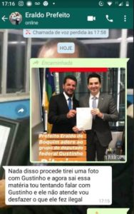 Pelas redes sociais prefeito de Boquim passa “pito” em Gustinho Ribeiro e nega que aderiu ao grupo do deputado E o deputado federal Gustinho Ribeiro precisa aprender muito ainda. Todo mês tem uma mancada. Desta vez, postou nas redes sociais uma foto com o prefeito Eraldo, de Boquim informando que o mesmo aderiu ao grupo dele. Ontem, 09, Eraldo postou a seguinte declaração: “Nada disso procede tirei uma foto com Gustinho Ribeiro e agora sai essa matéria tou tentando falar com Gustinho e ele não atende vou desfazer o que ele fez ilegal.”’