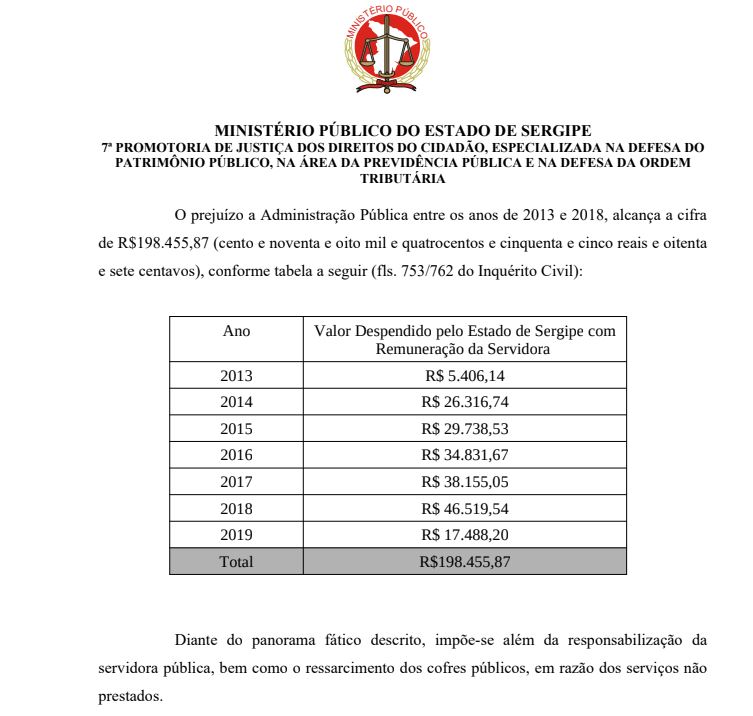 Segundo a ação do MPE, o prejuízo à Administração Pública, entre os anos de 2013 e 2018, alcança a cifra de R$198.455,87 (cento e noventa e oito mil e quatrocentos e cinquenta e cinco reais e oitenta e sete centavos), conforme tabela a seguir (fls. 753/762 do Inquérito Civil/ ver print ao lado): Diante do panorama fático descrito, impõe-se além da responsabilização da servidora pública, bem como o ressarcimento dos cofres públicos, em razão dos serviços não prestados. Além do ressarcimento, a ação do MPE pede também a condenação da ré por improbidade administrativa, no ônus de sucumbência e perda da função pública, pagamento de multa civil de até cem vezes o valor da remuneração percebida pelo agente, entre outros. O MPE ainda pediu para que o valor da causa seja de R$ 793 mil.