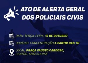 Assembleia Extraordinária Durante o Ato de Alerta de Geral, os policiais civis aproveitarão a oportunidade para definir os próximos encaminhamentos da categoria em Assembleia Geral Extraordinária no mesmo local. Na oportunidade, o momento contará com informação e discussão sobre: – Encaminhamentos por parte da Polícia Civil, Secretaria da Segurança Pública e governador Belivaldo Chagas no tocante ao Projeto Oficial de Polícia Civil (OPC). Além disso, haverá deliberação sobre: – Futuras paralisações da categoria; – Planejamento e início da OPC Legal (A OPERAÇÃO).