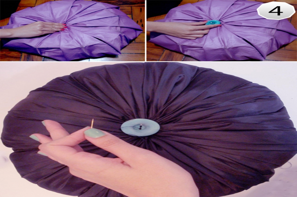 Dê alguns pontos e prendas as pétalas. Após isso pregue um botão no centro e finalize os dois lados da almofada. Não esqueça de apertar bem