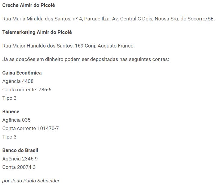 Creche Ação Solidária Almir do Picolé – (79) 3248-1413 https://www.instagram.com/almirdopicole/