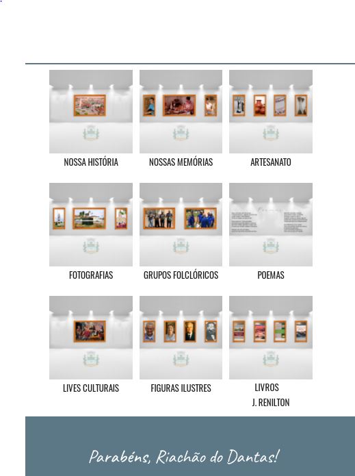 Está no ar a 1ª galeria virtual de Riachão do Dantas! No mês em que comemoramos 151 anos, a Diretoria Municipal de Cultura e o Departamento de Comunicação prepararam uma programação especial para que todos possam acompanhar na segurança dos seus lares. A 1ª galeria virtual apresenta um resumo do histórico do povo riachãoense, memórias, fotografias, poemas, músicas, vídeos, artesanatos e figuras públicas. É a identidade de Riachão do Dantas apresentada ao mundo. A grande parte do material apresentado foi produzido manualmente pelos artistas contemplados nos editais da Lei Aldir Blanc. A exposição, inicialmente virtual, é itinerante e visitará em um momento mais seguro, escolas, espaços públicos e feiras culturais de Sergipe. Uma novidade muito especial é a disponibilização da coleção dos livros escritos pelo historiador José Renilton Nascimento Santos, que você agora pode acessar e ler gratuitamente pelo seu celular! Acesse através do link: https://sites.google.com/view/riachaododantas151/   Sejam bem-vindos! Parabéns, artistas! Viva Riachão do Dantas!