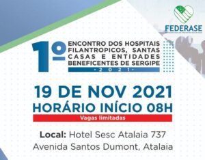 Federase realiza Primeiro Encontro dos Hospitais Filantrópicos de Sergipe A Federação das Santas Casas e Hospitais Filantrópico de Sergipe (Federase) realizará nesta próxima sexta-feira, 19, o Primeiro Encontro dos Hospitais Filantrópicos, Santas Casas e Entidades Beneficentes de Sergipe, com o objetivo de fortalecer e qualificar os serviços assistenciais de saúde. Totalmente gratuito, o evento acontecerá, presencialmente, no auditório do Hotel Sesc Atalaia, a partir das 8h30.