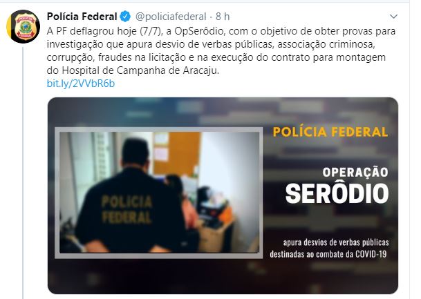 Na manhã desta terça-feira, 7, a Polícia Federal deflagrou a Operação Serôdio, cumpriu nove mandados de busca e apreensão em Aracaju e Nossa Senhora do Socorro para apurar desvio de verbas públicas, associação criminosa, corrupção, fraudes na licitação e na execução do contrato para montagem da estrutura do Hospital de Campanha de Aracaju.