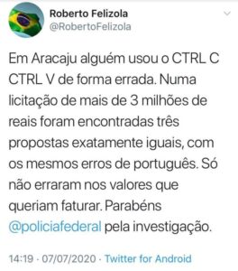 Numa licitação de mais de 3 milhões de reais foram encontradas três propostas exatamente iguais, com os mesmos erros de português. Só não erraram nos valores que queriam faturar. Parabéns @policiafederal pela investigação.