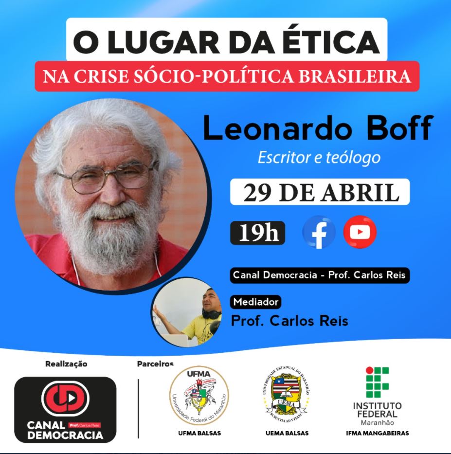 Hoje, 29, às 19h: O lugar da Ética na crise sócio-política brasileira É esse o tema da live que será realizada nesta quinta-feira, 29, às 19h, com o escritor e teólogo, Leonardo Boff, no Canal Democracia, do professor Carlos Reis que será o mediador. Não perca! https://www.facebook.com/canaldemocraciacarlosreis https://www.youtube.com/c/CanalDemocraciaProfCarlosReis/featured