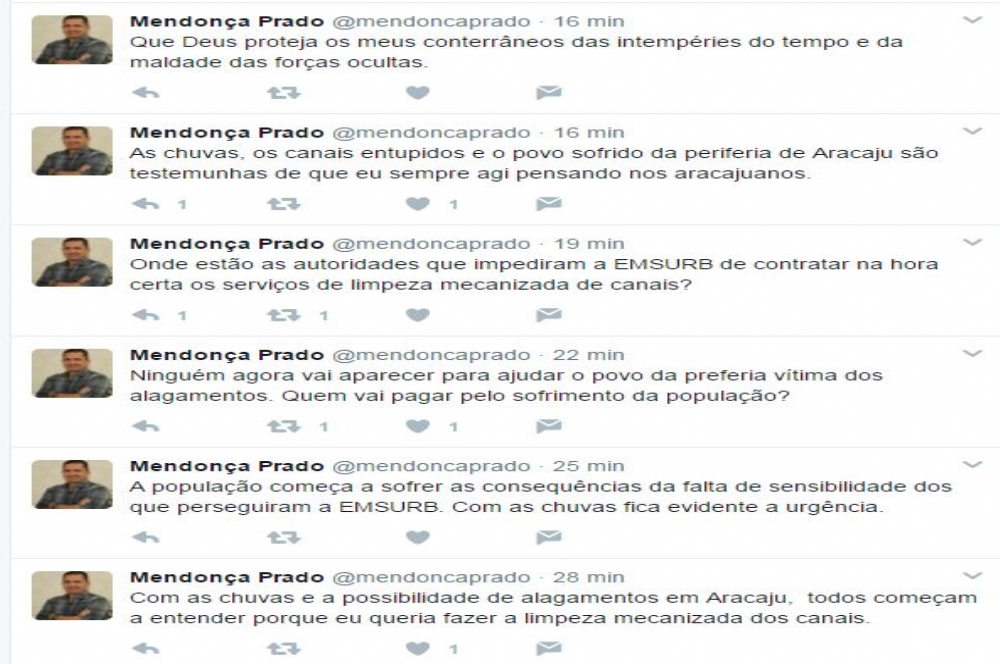 feita ontem,23, por Mendonça Prado, presidente afastado da Emsurb, pelo twitter durante as fortes chuvas que alagaram boa parte de Aracaju.