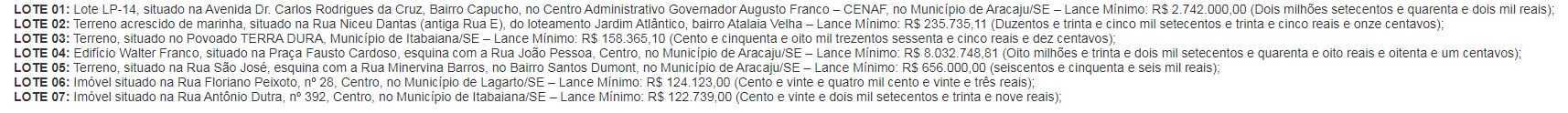 I Leilão de Bens Imóveis acontece nesta quinta-feira Acontece hoje, 24, às 9h, o I Leilão de Bens Imóveis, deste ano. O leilão, do tipo maior oferta, será realizado de forma online por meio do site www.lancese.com.br. Estão sendo disponibilizados oito imóveis, através de lotes, onde cinco são de propriedade do Estado de Sergipe e três de propriedade do Instituto de Promoção e de Assistência à Saúde de Servidores do Estado de Sergipe (Ipesaúde).O leilão será realizado pela Secretaria de Estado da Administração (Sead), através da Superintendência de Gestão de Patrimônio do Estado (Supat). A arrematação será conduzida pelo leiloeiro público Valério César de Azevedo Déda, com registro na Junta Comercial do Estado de Sergipe sob o nº 07/2008. Com alienação dos imóveis que se encontram em desuso pela Administração Pública Estadual, o dinheiro arrecadado será destinado para a Previdência do Estado. Veja os imóveis que serão leiloados em oito lotes: