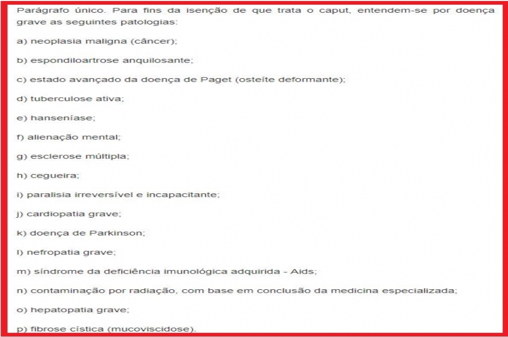 | A lista das doenças consideradas graves que estão na lei municipal que isenta o único imóvel do IPTU. |