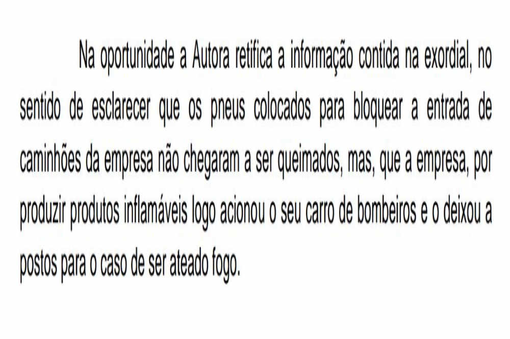 daqueles que estão sendo lesados pela empresa agora vem retificar a informação dizendo que não houve fogo nos pneus.Isso não deixa de ser uma zombaria do Judiciário, um atentado contra a dignidade da Justiça, pois todos sabem que não se deve levar a apuração do juiz fatos que não ocorreram para conseguir resultado a seu favor.Isso só mostra com quem estamos lidando, é importante ficarmos atentos às inúmeras mentiras que eles informam nos processos.”