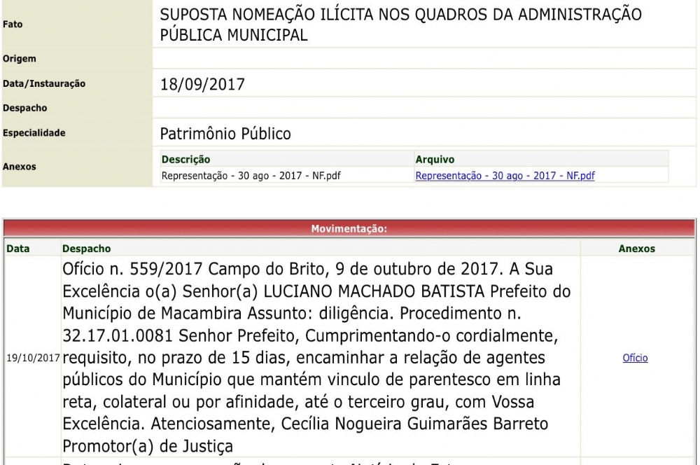 “No último dia 19, o promotor de Justiça da Comarca de Campo do Brito, por meio de Ofício, pediu ao prefeito Luciano de Vital, uma lista com nomes de todos agentes públicos que possuam parentesco em linha reta, colateral ou por afinidade, até o terceiro grau com o prefeito. O Ofício se-da devido ao andamento da denúncia feita pelo presidente da Câmara de Vereadores, Pedro Alves, sobre supostas contratações ilícitas e a prática de Nepotismo, como cumprimento da investigação o prefeito de Macambira tem o prazo de 15 dias contados da data do envio, para fornecer todas as informações pedidas pelo Ministério Público.”