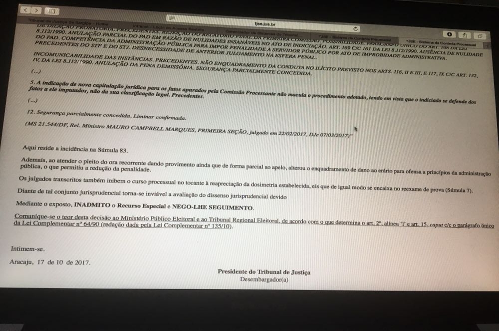 Rogério Carvalho está com os direitos políticos suspensos. Presidente do TJ/SE informou ao presidente do TRE/SE e ao MPE No último dia 17 de outubro o ex-deputado federal Rogério Carvalho teve recurso negado no Tribunal de Justiça de Sergipe conforme print ao lado. O presidente do TJ/SE, desembargador Cesário Siqueira enviou comunicado ao presidente do TRE/SE e ao Ministério Público Eleitoral. Rogério ainda tem outro recursos tramitando em Sergipe e será julgado no próximo dia 31 de outubro. O relator é o desembargador Luis Mendonça.
