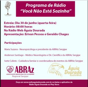 ABRAz Sergipe Estreia hoje, 30, às 08h, o programa de rádio “Você não está sozinho”. Realizado em parceria entre a Associação Brasileira de Alzheimer Regional Sergipe (ABRAz Sergipe) e a Rádio Web Águia Dourada, o programa abordará semanalmente temas relacionados à doença de Alzheimer e cuidados com a pessoa idosa. A primeira edição contará com a participação da neuropsicóloga e presidente da ABRAz Sergipe, Maria Suzana Souza que irá explicar como foi a fundação da instituição no Estado, suas ações, população contemplada, desafios e