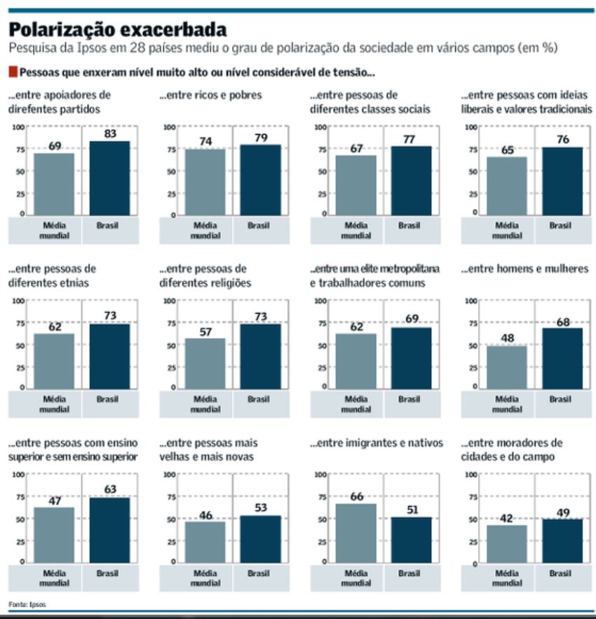 O jornal Valor publicou dados de uma pesquisa global, da Ipsos, que constatou que de cada dez brasileiros, oito concordam que há muito ou considerável tensão no país entre apoiadores de diferentes partidos políticos. O resultado foi apurado numa pesquisa global da Ipsos, que investigou a percepção das pessoas a respeito de temas com potencial de gerar tensão e polarização nas sociedades. A pesquisa foi feita simultaneamente em 28 países, com 23.004 entrevistas no total. As pessoas foram provocadas a dizer se enxergavam muita tensão, considerável tensão, pouca ou nenhuma tensão em diversos campos, como nas relações entre ricos e pobres, entre adeptos de diferentes religiões e entre homens e mulheres. O Brasil ficou acima da média mundial em 11 das 12 questões investigadas. Só ficou abaixo da média no questionamento sobre a relação entre imigrantes e pessoas nascidas no próprio país. Veja no print abaixo.