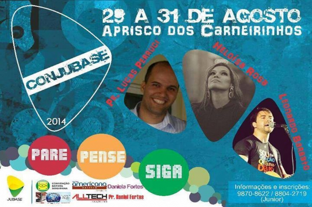 Pare. Pense. Siga. Nestas três palavras a JUBASE – Juventude Batista de Sergipe – baseará o seu congresso anual. Marcado para os dias 29, 30 e 31 de agosto, no Aprisco dos Carneirinhos, em São Cristóvão/SE, o CONJUBASE 2014 visa reunir jovens e adolescentes de todo o estado, tanto batistas quanto de outras denominações, em dias de comunhão e crescimento espiritual.