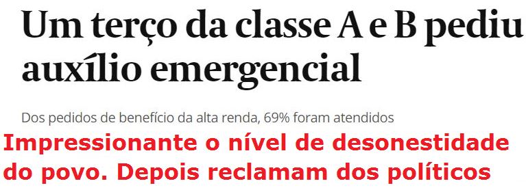 Matéria veiculada pelo jornal Valor Econômico mostrou que um terço das famílias das classes A e B solicitou o auxílio emergencial de R$ 600 do governo federal nos últimos meses – e 69% foram aprovadas para receber o benefício. Isso significa que 3,89 milhões de famílias mais ricas têm algum integrante recebendo a ajuda criada para apoiar trabalhadores pobres na pandemia.