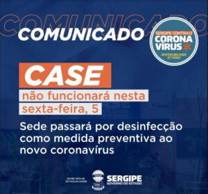 Utilidade Pública Em virtude da desinfecção do prédio do Case nesta sexta-feira, 5, como medida de prevenção à pandemia do novo coronavírus, alguns serviços da unidade sofrerão alterações, como a entrega domiciliar de medicamentos e insumos para os usuários de Aracaju, que será transferida para este sábado, 6.O cadastro de novos pacientes e o Serviço de Atendimento ao Preposto (SAP) estarão disponíveis apenas na segunda-feira, 8.