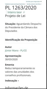 pandemia. O blog recebeu apelos de vários corretores de imóveis que não tiveram acesso ao auxilio emergencial por conta da renda na declaração do IR de 2018. E hoje a realidade é totalmente diferente por conta da pandemia. O blog foi informado a Associação de Corretores de Imóveis em Sergipe (ACI/SE) tem ajudado discretamente, mas não é o suficiente para muitos. O deputado federal Júnio Mano (PL/CE) apresentou um projeto (PL 1263/20) para reduzir temporariamente os valores das anuidades dos conselhos profissionais, mas está parada a proposta. Os conselhos federal e estadual não deram nenhum desconto, apenas parcelaram como já vem sendo feito há alguns anos. É preciso que os membros dos conselhos façam uma comissão, analisando caso a caso para que seja dado um desconto aos corretores que estão passando por problemas financeiros neste momento.