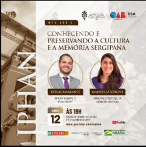 Webinário hoje, 12/04, às 19h Conhecendo e preservando a cultura e a memória sergipana Com a participação de Diego Amarante, superintendente do Iphan em Sergipe e Manuella Vergne, curadora do Memorial da Advocacia Sergipana. Inscrições gratuitas aqui. Transmissão ao vivo pelo canal da OAB/SE:https://www.youtube.com/user/OABSE/featured