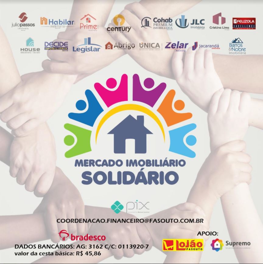 TODOS CONTRA A FOME O mercado imobiliário Sergipano, representado por algumas das principais imobiliárias do Estado se uniram em prol de uma campanha do bem. Em tempos de pandemia onde o desemprego e paralisação de importantes atividades tem gerado fome nos unimos para tentar diminuir um pouco o sofrimento de muitas famílias. Surgindo assim de 09 a 30 de abril a campanha MERCADO IMOBILIÁRIO SOLIDÁRIO. Contamos com o apoio do Lojão Fasouto que abriu uma conta especifica para a campanha e que a cada 10 cestas adquiridas através da campanha será doado serão entregues 11 unidades. Abrimos também nossas empresas como ponto de coletas para que você nosso amigo, cliente, parceiro, seguidor possa também participar dessa corrente do bem. O valor de cada cesta no Lojão Fasouto ficou a R$ 45,86 e pode ser pago através do PIX e-mail : coordenacao.financeiro@fasouto.com.br ou através de deposito ou transferência para conta corrente 0113920-7 da agencia 3162 do Banco Bradesco, CNPJ: 15.598.527/0001-37. Contamos com seu apoio para que possamos ajudar o maior número de famílias. “RECEBEMOS À MEDIDA QUE DOAMOS SINCERA E ESPONTANEAMENTE” Givitor.