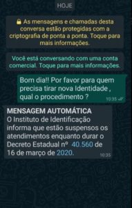 Cadê a parceria Instituto Identificação e a Receita? Muita gente precisando de carteira de identidade Na próxima semana o que já é um problema hoje vai aumentar. A caixa está agendando saque emergencial, seguro desemprego, bolsa família, saúde, gestante após oito meses de gestão, todos com comprovação. E se tiverem sem carteira de identidade não poderão ser atendidos. Pela mensagem enviada ontem para o whatsApp do Instituto de identificação ficou comprovado que estão suspensos os atendimentos. O que fazer quem precisa da carteira de identidade?