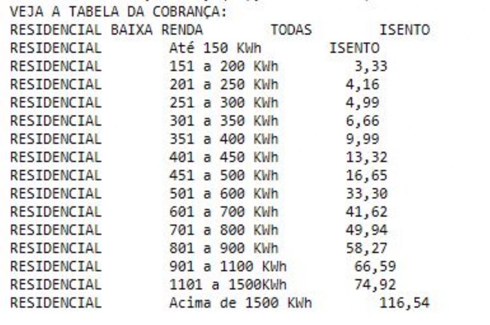 pública no Município de Aracaju. De acordo com o projeto a contribuição será empregada em diversas despesas como a energia elétrica destinada à iluminação de vias, logradouros e demais bens públicos municipais, assim como a instalação, manutenção, melhoramento e expansão da rede de iluminação pública. Os consumidores até 150KWh serão isentos. Veja a tabela ao lado.
