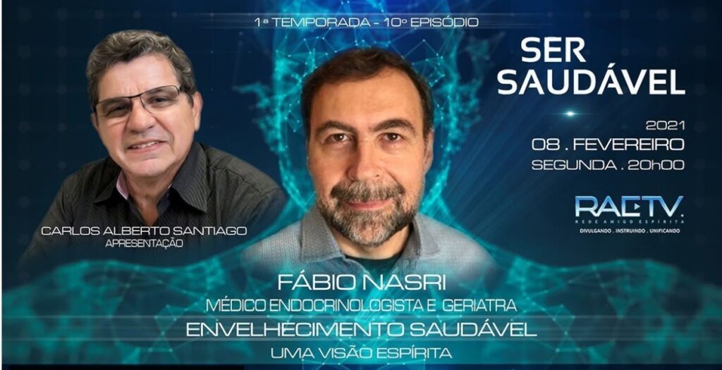 Programa Ser Saudável: último episódio da 1ª temporada hoje, 08/02, às 20h Você sabia que hoje, 08, às 20h, será exibido o último episódio da 1ª Temporada do programa “Ser Saudável”? O tema será “Envelhecimento Saudável” tendo como convidado Fábio Nasri (SP), médico pela UNIFESP/EPM, possui mestrado em Medicina (Endocrinologia Clínica) também pela UNIFESP e especialização em geriatria pela European Academy for Medicine of Ageing, EAMA, Suíça. Foi coordenador do programa de Geriatria e Gerontologia do Hospital Albert Einstein, em São Paulo (SP). Colabora como pesquisador do ProSER, investigando a espiritualidade em idosos. Medico voluntário do Programa de Religiosidade e Espiritualidade do Instituto de Psiquiatria da Faculdade de Medicina da USP. O programa é apresentado por Carlos Alberto Santiago, médico ginecologista, obstetra com especialidade em medicina de família e comunidade, orador espírita, membro da Associação Médico-Espírita de Sergipe – AME/SE, vice-presidente da Federação Espírita do Estado de Sergipe – FEES, vice-presidente e coordenador do ESDE do Grupo Espírita Trabalhadores do Bem. O programa tem a produção do abnegado Chico Leite; gerente de operação, Matheus Henrique, direção técnica, Márcio Monteiro; direção geral, José Aparecido dos Santos e realização e transmissão pela RAETV – Rede Amigo Espírita. Link de Acesso: