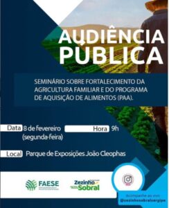 Federação de Agricultura e Pecuária do Estado de Sergipe (Faese) e o deputado estadual Zezinho Sobral realizam hoje, 08, às 9 horas, ‘Audiência Pública sobre o fortalecimento da Agricultura Familiar e o Programa de Aquisição de Alimentos (PAA)’. O encontro, que acontecerá de forma mista, será no Parque de Exposições João Cleophas e terá a transmissão pelas redes sociais do parlamentar e da federação. A audiência contará com a presença de representantes das Secretarias de Estado da Agricultura, Educação e Inclusão, gestores municipais, membros de cooperativas e associações de agricultura familiar, Sebrae e da Companhia Nacional de Abastecimento (Conab), que conversarão sobre as perspectivas e os avanços para os chamamentos públicos e a aplicabilidade do PAA. Aqui: https://www.instagram.com/zezinhosobralsergipe/?hl=pt e https://www.instagram.com/sistemafaesesenar/?hl=pt