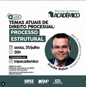 Live hoje, 31/07, às 20h Temas atuais de direito processual: processo estrutural O MP Acadêmico realiza nesta sexta-feira, 31, mais uma live a partir das 20h. Desta vez o convidado é o advogado, escritor e professor da UFBA, Fredie Didier, que discorrerá sobre o tema de direito processual “Processo Estrutural.” Transmissão em: