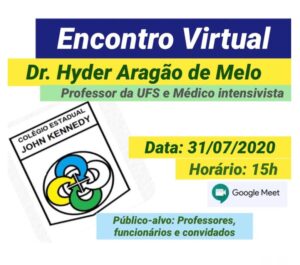 Encontro virtual, hoje, 31/07, às 15h Tendo como público alvo professores, funcionários e convidados o Colégio Estadual John Kennedy, realiza hoje, 31, às 15h, mais um encontro virtual com a participação do Dr. Hyder Aragão de Melo, professor da UFS e médico intensivista.