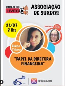 Live hoje, 31/07, 21h Ciclo de lives da Associação de Surdos Hoje, 31, tem mais uma live do ciclo que vem sendo realizado pela Associação de Surdos O tema hoje será o papel da diretora financeira, tendo como palestrante Elaine Thiara e mediadora, Vivian Caroline. Participe: https://www.instagram.com/guiasurdo/