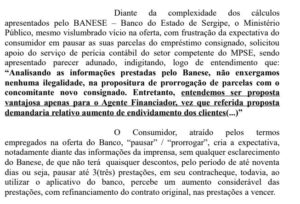 Empréstimos servidores no Banese E através da promotora Euza Missano, impetrou agravo contra decisão do Tribunal de Justiça que possibilitou ao governo do Estado, auferir lucros do Banese durante a pandemia da COVID-19, tendo como consequência prejuízos financeiros decorrentes da renovação de empresários dos servidores públicos. O agravo: Agravo do MPE contra banese