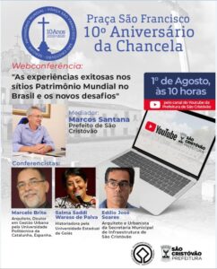 São Francisco, a Prefeitura de São Cristóvão irá promover, no próximo sábado (1°), às 10h, uma webconferência que terá como tema “As experiências exitosas nos sítios Patrimônio Mundial do Brasil e novos desafios”. O evento será transmitido pelo canal da Prefeitura no YouTube. A webconferência terá como mediador o prefeito Marcos Santana, e contará com a participação do arquiteto, Doutor em Gestão Urbana pela Universidade Politécnica da Catalunha, Marcelo Brito, da historiadora pela Universidade Estadual de Goiás, Salma Saddi Waress de Paiva, e do arquiteto e Urbanista da Secretaria Municipal de Infraestrutura de São Cristóvão, Edílio José Soares.