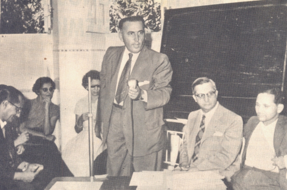 | Carlos Firpo discursa em solenidade no Hospital Santa Isabel, em 1958.Sentados, à direita, Juliano Simões e Seixas Dória. |
