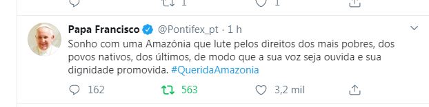 www.twitter..com/Pontifex_pt (Papa Francisco) Sonho com uma Amazónia que lute pelos direitos dos mais pobres, dos povos nativos, dos últimos, de modo que a sua voz seja ouvida e sua dignidade promovida. #QueridaAmazonia