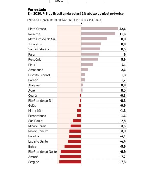 Segundo a matéria, apenas 12 Estados e o Distrito Federal deverão terminar 2020 com o Produto Interno Bruto (PIB) acima do nível pré-crise. Apesar das expectativas de maior expansão da atividade econômica neste ano, os demais Estados ainda precisarão de mais tempo para recuperar o tamanho de sua economia antes da recessão, em 2013 e 2014, segundo levantamento feito pela Tendências Consultoria Integrada. Nessa lenta recuperação, o PIB brasileiro fechará o ano 1% abaixo do nível pré-crise.