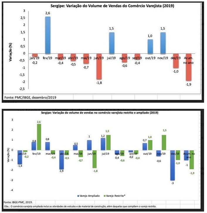 Sergipe: vendas em dezembro foram menores que em novembro, segundo a PMC do IBGE E tem mais números negativos. O resultado da Pesquisa Mensal de Preços divulgada ontem, 12, pelo IBGE, mostra que em dezembro houve recuo de 1% nas vendas do varejo restrito e 3% nas vendas do varejo ampliado em Sergipe. Ou seja, em dezembro, mês das compras e do Natal, as vendas em Sergipe foram menores do que em novembro. Já no ano, Sergipe tem um recuo de 1,9% nas vendas do varejo restrito.