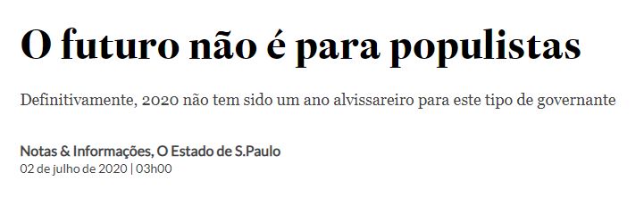 Do ponto de vista estritamente político, não seria exagero afirmar que a pandemia de covid-19 é a maior ameaça à farsa populista desde a 2.ª Guerra. Exceto para desonrosas exceções, como Viktor Orbán, na Hungria, Rodrigo Duterte, nas Filipinas, e Daniel Ortega, na Nicarágua, entre outros autocratas que usam a emergência sanitária como subterfúgio para concentrar ainda mais poder e calar vozes críticas em seus países, 2020, definitivamente, não tem sido um ano alvissareiro para populistas mundo afora. Isso não quer dizer, é claro, que o populismo como instrumento de ação política esteja com os dias contados. Mas é fato que a eclosão da pandemia fez as sociedades escrutinarem com muito mais diligência as ações de seus governantes. E os governantes populistas têm se saído mal neste teste de qualidade.