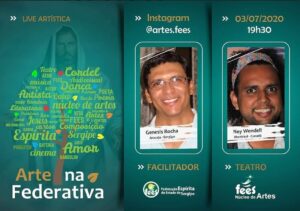 Live hoje, 03/07, às 19h30 Arte na Federativa Hoje, 03, às 19h30 no Canal do Instagram: https://www.instagram.com/artesfees/ acontecerá a estreia da Live Arte na Federativa com Genesis Rocha/SE. E na primeira live a participação do artista espírita: Ney Wendell – Montreal/Canadá. O programa é uma realização do Núcleo de Artes da Assessoria de Artes e Eventos da Federação Espírita do Estado de Sergipe.