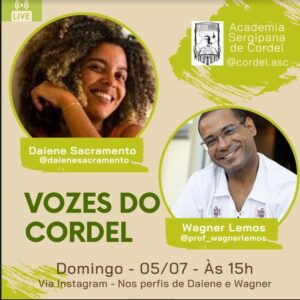 Live domingo, 05/07, às 15h Vozes do Cordel A Academia Sergipana de Cordel realiza no próximo domingo 05, às 15h, a Live Vozes do Cordel com as presenças de Daiene Sacramento e Wagner Lemos. A live pelo instagram pode ser acompanhada nos perfis https://www.instagram.com/daienesacramento/ e https://www.instagram.com/prof_wagnerlemos/