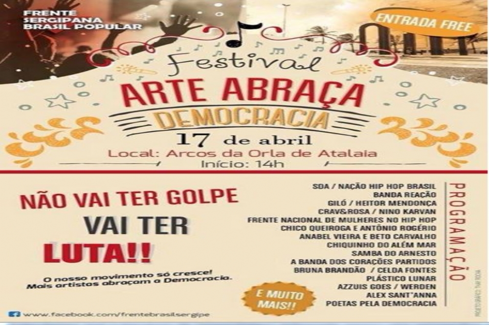 Portanto, nós artistas Sergipanos que compreendemos que só se constrói cultura e uma sociedade verdadeiramente livre, fraterna e justa em uma democracia assinamos esse manifesto e ousamos gritar, cantar, atuar, mostrando a todos que não vai ter Golpe, vai ter ARTE!