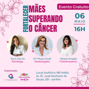 Evento gratuito em prol das mães que estão na batalha contra o câncer de mama A Cormamare – clínica especializada em mastologia e câncer de mama, e o Grupo de apoio a pacientes oncológicas – Flores do Nosso Jardim, promovem na próxima sexta-feira, (06), às 16 horas, o encontro “Mães Superando o Câncer”, com o objetivo de homenagear as mães e mulheres guerreiras através de uma tarde com informações sobre o cenário do câncer de mama, tratamento e chances de cura. O evento é gratuito e terá a participação da mastologista, Dra. Paula Saab, a psicóloga, Sara Garcia, e da fisioterapeuta, Maysa Aragão. O câncer de mama é o tipo de câncer mais comum entre as mulheres no mundo e no Brasil, depois do câncer de pele não melanoma. A incidência do câncer de mama em mulheres jovens e com filhos pequenos tem aumentado nos últimos anos. O cenário reforça a necessidade de levarmos informações e orientações a essas mulheres e mães passando por um momento delicado de sua vida. Portanto, participe!!! Para maiores informações: 9 9924-9332 (Gardênia). Lembrando que o encontro será realizado no Auditório NB Hotéis – Avenida Dr. José Machado de Souza, 160 – Jardins.